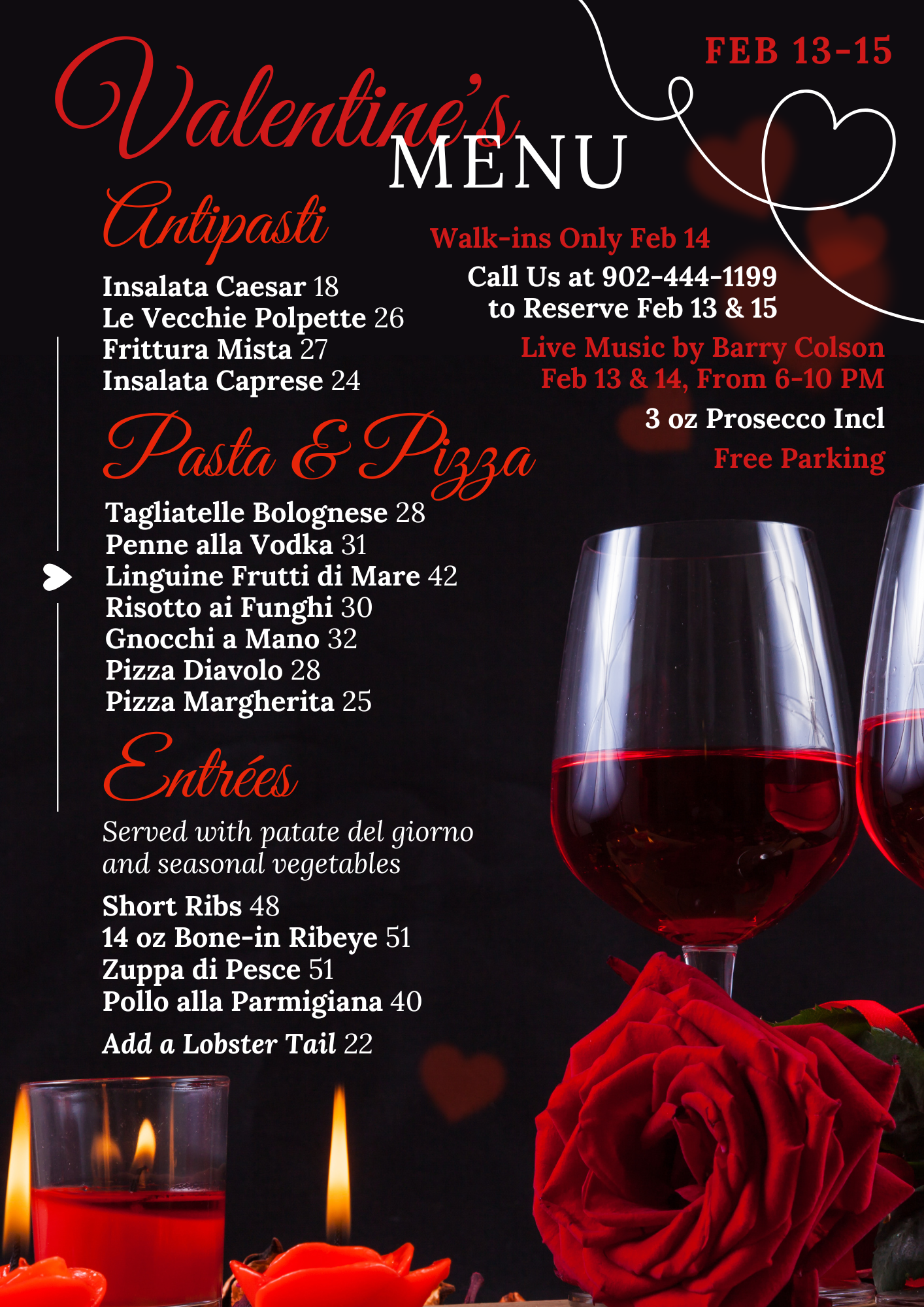 Celebrate Valentine’s Day with walk-ins only on Feb 14, or call to reserve for Feb 13 & 15. Enjoy live music by Barry Colson on Feb 13 & 14 from 6–10 PM, sip on a complimentary 3 oz Prosecco, and take advantage of free parking while you soak in the romantic atmosphere. See our menu.